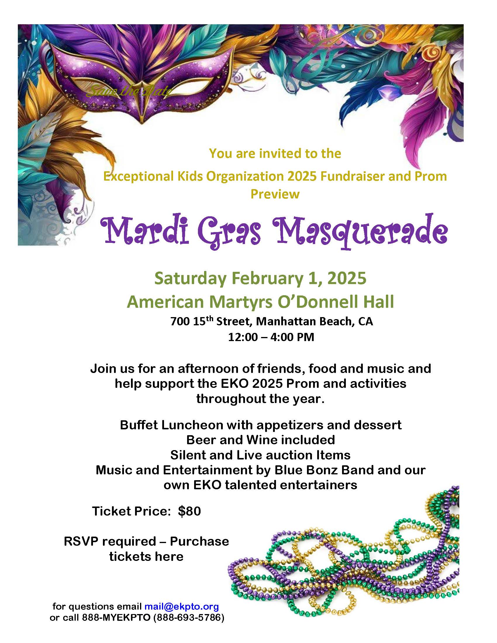 Join us for an afternoon of friends, food and music and help support the EKO 2025 Prom and activities throughout the year. Buffet Luncheon with appetizers and dessert Beer and Wine included Silent and Live auction Items Music and Entertainment by Blue Bonz Band and our own EKO talented entertainers Ticket Price: $80 RSVP required